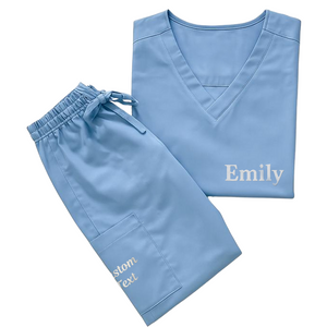- ncludes V-neck scrub top and drawstring pants – both customizable with embroidered text