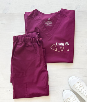 - ncludes V-neck scrub top and drawstring pants – both customizable with embroidered text